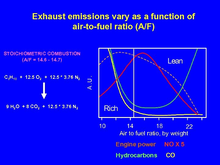 Exhaust emissions vary as a function of air-to-fuel ratio (A/F) STOICHIOMETRIC COMBUSTION (A/F = 14. 6 - 14. 7) C 8 H 18 + 12. 5 O 2 + 12. 5 * 3. 76 N 2 9 H 2 O + 8 CO 2 + 12. 5 * 3. 76 N 2 Air to fuel ratio, by weight Engine power NO X 5 Hydrocarbons CO