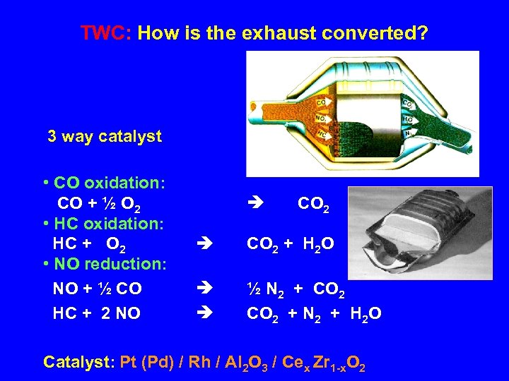 TWC: How is the exhaust converted? 3 way catalyst • CO oxidation: CO + ½ O 2 • HC oxidation: HC + O 2 • NO reduction: NO + ½ CO HC + 2 NO CO 2 + H 2 O ½ N 2 + CO 2 + N 2 + H 2 O Catalyst: Pt (Pd) / Rh / Al 2 O 3 / Cex Zr 1 -x. O 2