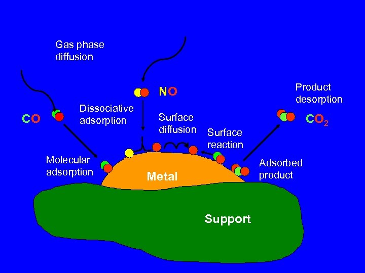 Gas phase diffusion Product desorption NO CO Dissociative adsorption Molecular adsorption Surface diffusion CO 2 Surface reaction Adsorbed product Metal Support