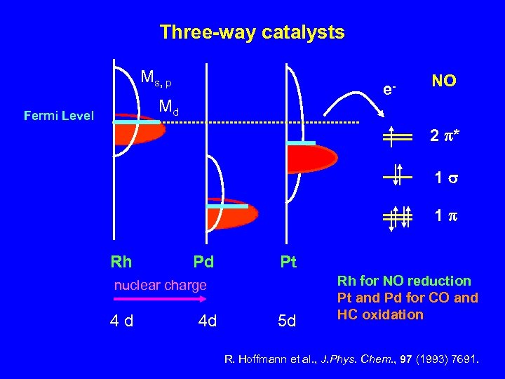 Three-way catalysts Ms, p e- Md Fermi Level NO 2 p* 1 s 1 p Rh Pd Pt nuclear charge 4 d 4 d 5 d Rh for NO reduction Pt and Pd for CO and HC oxidation R. Hoffmann et al. , J. Phys. Chem. , 97 (1993) 7691.