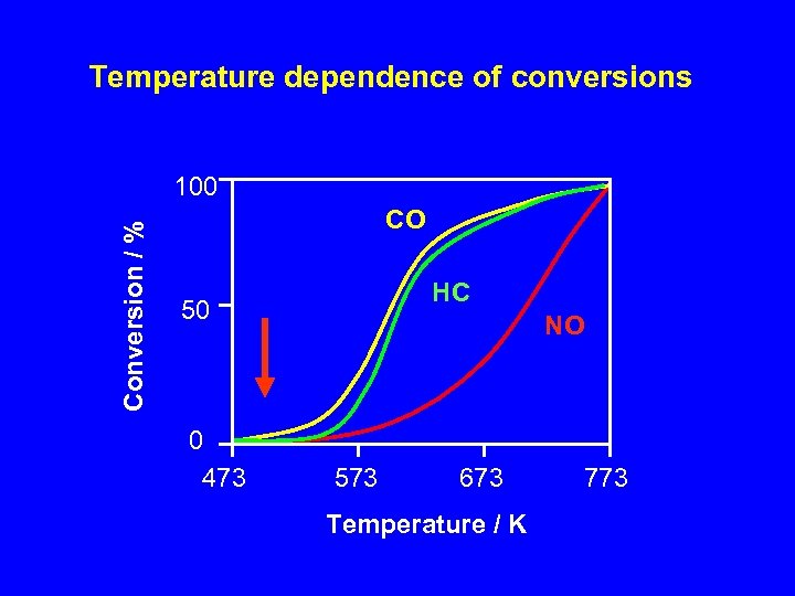 Temperature dependence of conversions Conversion / % 100 CO HC 50 0 473 NO 573 673 Temperature / K 773