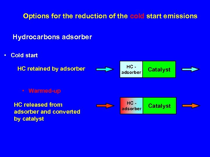 Options for the reduction of the cold start emissions Hydrocarbons adsorber • Cold start HC retained by adsorber HC adsorber Catalyst • Warmed-up HC released from adsorber and converted by catalyst