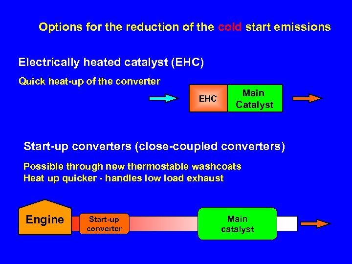 Options for the reduction of the cold start emissions Electrically heated catalyst (EHC) Quick heat-up of the converter EHC Main Catalyst Start-up converters (close-coupled converters) Possible through new thermostable washcoats Heat up quicker - handles low load exhaust Engine Start-up converter Main catalyst