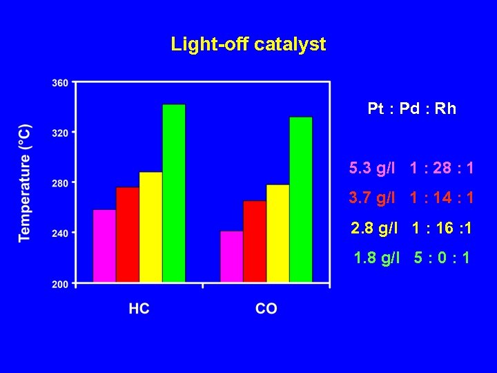 Light-off catalyst Pt : Pd : Rh 5. 3 g/l 1 : 28 : 1 3. 7 g/l 1 : 14 : 1 2. 8 g/l 1 : 16 : 1 1. 8 g/l 5 : 0 : 1