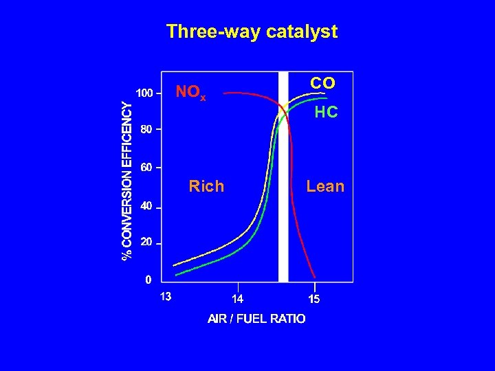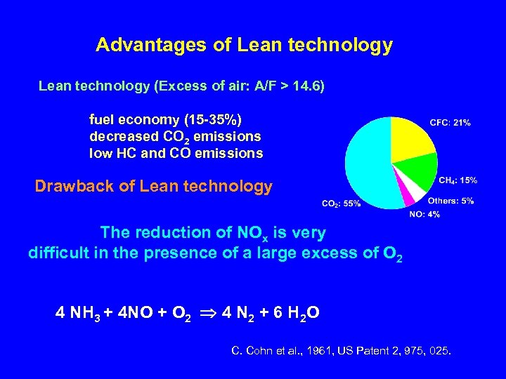 Advantages of Lean technology (Excess of air: A/F > 14. 6) fuel economy (15 -35%) decreased CO 2 emissions low HC and CO emissions Drawback of Lean technology The reduction of NOx is very difficult in the presence of a large excess of O 2 4 NH 3 + 4 NO + O 2 4 N 2 + 6 H 2 O C. Cohn et al. , 1961, US Patent 2, 975, 025.