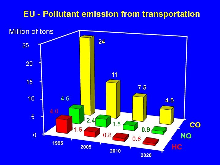 EU - Pollutant emission from transportation Million of tons 24 25 20 11 15 7. 5 10 5 0 4. 6 4. 5 4. 0 2. 4 1. 5 0. 8 0. 9 0. 6 CO NO HC