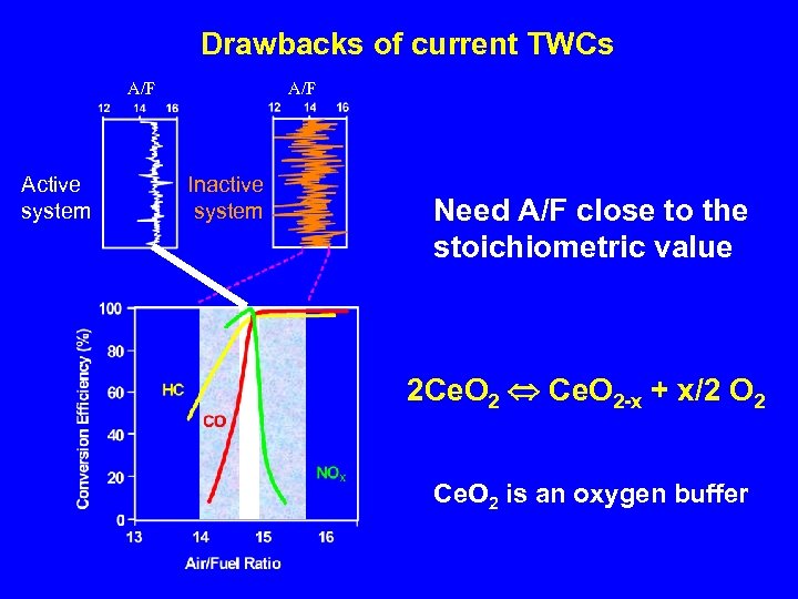 Drawbacks of current TWCs A/F Active system A/F Inactive system Need A/F close to the stoichiometric value 2 Ce. O 2 Ce. O 2 -x + x/2 O 2 Ce. O 2 is an oxygen buffer