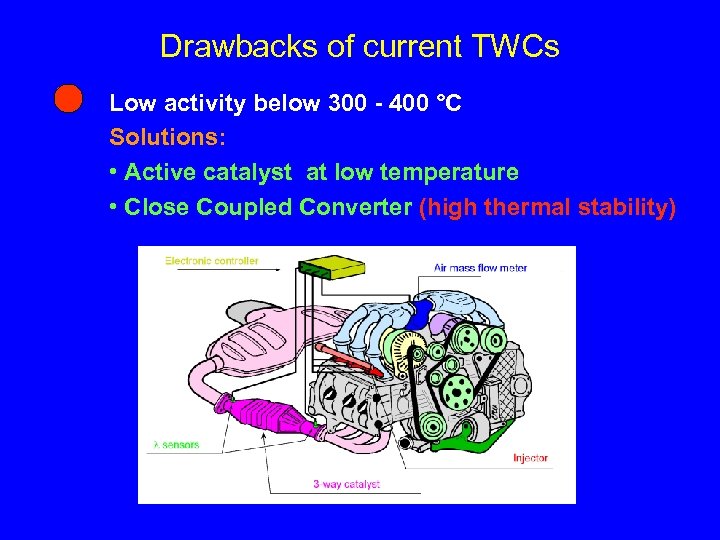 Drawbacks of current TWCs Low activity below 300 - 400 °C Solutions: • Active catalyst at low temperature • Close Coupled Converter (high thermal stability)