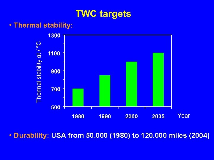 TWC targets Thermal stability at / °C • Thermal stability: Year • Durability: USA from 50. 000 (1980) to 120. 000 miles (2004)