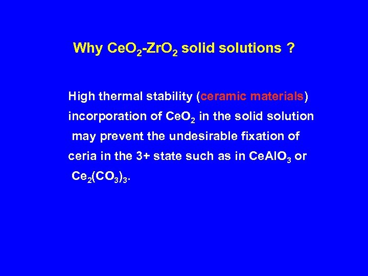 Why Ce. O 2 -Zr. O 2 solid solutions ? High thermal stability (ceramic materials) incorporation of Ce. O 2 in the solid solution may prevent the undesirable fixation of ceria in the 3+ state such as in Ce. Al. O 3 or Ce 2(CO 3)3.