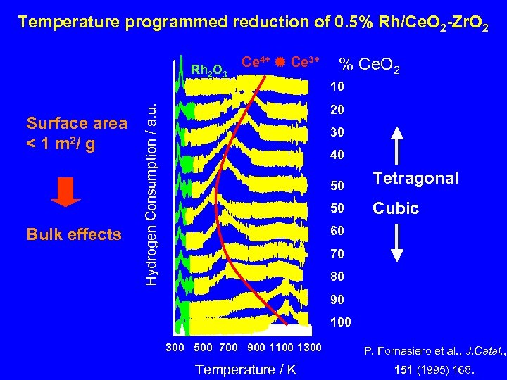 Temperature programmed reduction of 0. 5% Rh/Ce. O 2 -Zr. O 2 Rh 2 O 3 Ce 4+ Ce 3+ % Ce. O 2 10 Bulk effects Hydrogen Consumption / a. u. Surface area < 1 m 2/ g 20 30 40 50 Tetragonal 50 Cubic 60 70 80 90 100 300 500 700 900 1100 1300 P. Fornasiero et al. , J. Catal. , Temperature / K 151 (1995) 168.