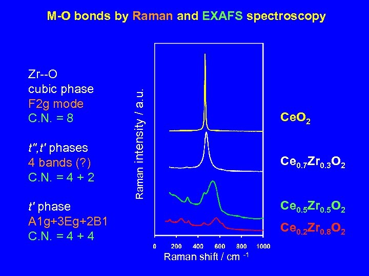 t", t' phases 4 bands (? ) C. N. = 4 + 2 t' phase A 1 g+3 Eg+2 B 1 C. N. = 4 + 4 Ce. O 2 Ce 0. 7 Zr 0. 3 O 2 Raman Zr--O cubic phase F 2 g mode C. N. = 8 intensity / a. u. M-O bonds by Raman and EXAFS spectroscopy Ce 0. 5 Zr 0. 5 O 2 Ce 0. 2 Zr 0. 8 O 2 Raman shift / cm -1