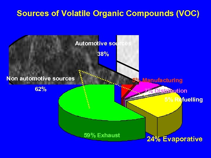 Sources of Volatile Organic Compounds (VOC) Automotive sources 38% Non automotive sources 5% Manufacturing 62% 7% Distribution 5% Refuelling 59% Exhaust 24% Evaporative
