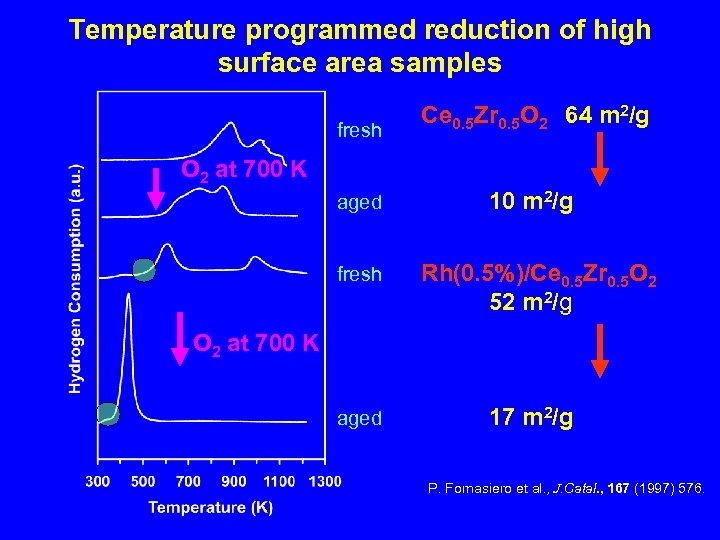 Temperature programmed reduction of high surface area samples fresh Ce 0. 5 Zr 0. 5 O 2 64 m 2/g aged 10 m 2/g O 2 at 700 K fresh Rh(0. 5%)/Ce 0. 5 Zr 0. 5 O 2 52 m 2/g O 2 at 700 K aged 17 m 2/g P. Fornasiero et al. , J. Catal. , 167 (1997) 576.