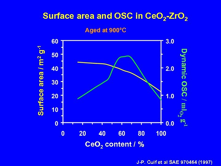 Surface area and OSC in Ce. O 2 -Zr. O 2 2 Dynamic OSC / ml. O g-1 Surface area / m 2 g-1 Aged at 900°C Ce. O 2 content / % J-P. Cuif et al SAE 970464 (1997)