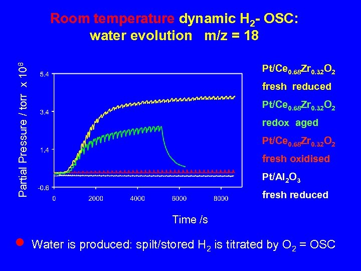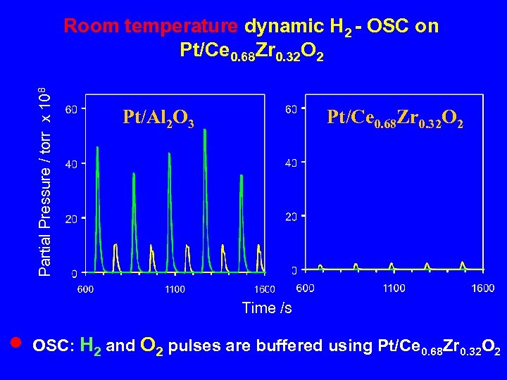 Partial Pressure / torr x 108 Room temperature dynamic H 2 - OSC on Pt/Ce 0. 68 Zr 0. 32 O 2 Pt/Al 2 O 3 Pt/Ce 0. 68 Zr 0. 32 O 2 Time /s n OSC: H 2 and O 2 pulses are buffered using Pt/Ce 0. 68 Zr 0. 32 O 2