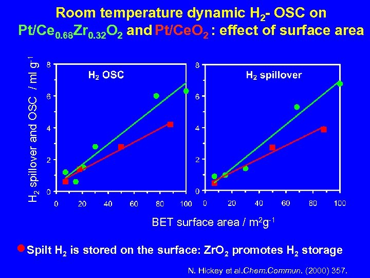 H 2 spillover and OSC / ml g-1 Room temperature dynamic H 2 - OSC on Pt/Ce 0. 68 Zr 0. 32 O 2 and Pt/Ce. O 2 : effect of surface area BET surface area / m 2 g-1 n. Spilt H 2 is stored on the surface: Zr. O 2 promotes H 2 storage N. Hickey et al. Chem. Commun. (2000) 357.