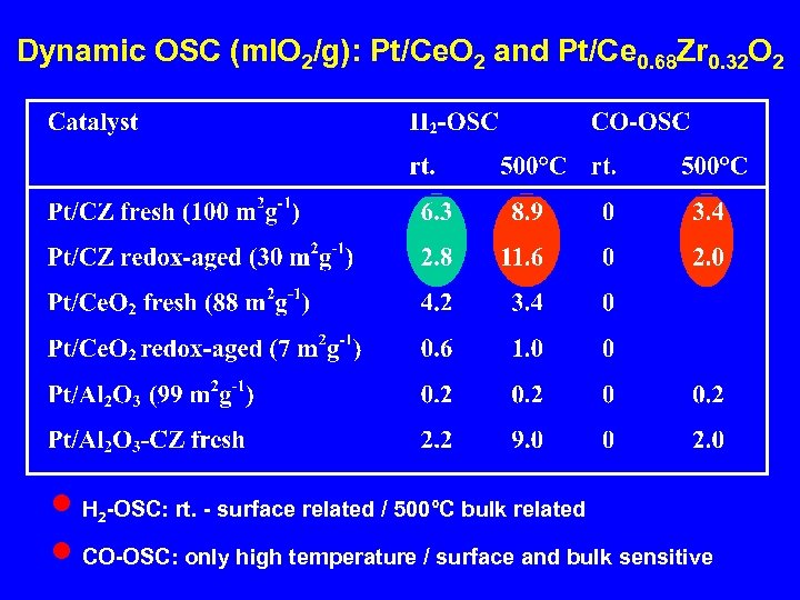Dynamic OSC (ml. O 2/g): Pt/Ce. O 2 and Pt/Ce 0. 68 Zr 0. 32 O 2 n H 2 -OSC: rt. - surface related / 500°C bulk related n CO-OSC: only high temperature / surface and bulk sensitive