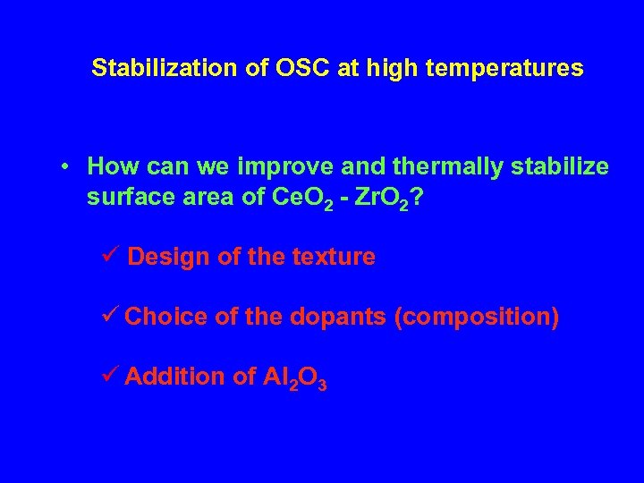 Stabilization of OSC at high temperatures • How can we improve and thermally stabilize surface area of Ce. O 2 - Zr. O 2? ü Design of the texture ü Choice of the dopants (composition) ü Addition of Al 2 O 3