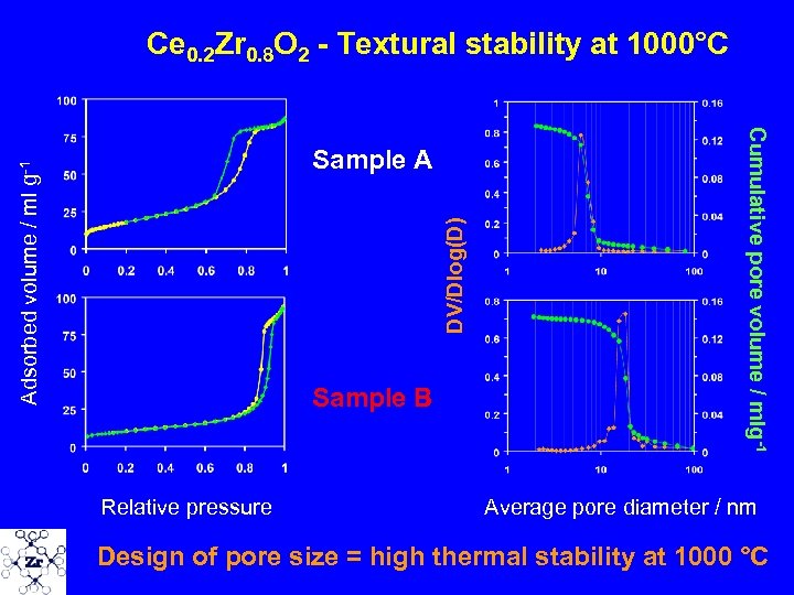 Ce 0. 2 Zr 0. 8 O 2 - Textural stability at 1000°C DV/Dlog(D) Adsorbed volume / ml g-1 Sample B Relative pressure Cumulative pore volume / mlg-1 Sample A Average pore diameter / nm Design of pore size = high thermal stability at 1000 °C