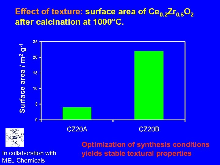 Surface area / m 2 g-1 Effect of texture: surface area of Ce 0. 2 Zr 0. 8 O 2 after calcination at 1000°C. In collaboration with MEL Chemicals Optimization of synthesis conditions yields stable textural properties