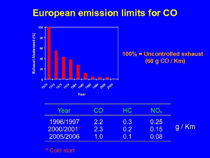 European emission limits for CO 100% = Uncontrolled exhaust (60 g CO / Km) g / Km * Cold start