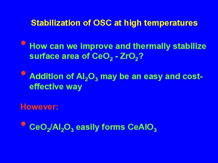 Stabilization of OSC at high temperatures • How can we improve and thermally stabilize surface area of Ce. O 2 - Zr. O 2? • Addition of Al O effective way 2 3 may be an easy and cost- However: • Ce. O /Al O 2 2 3 easily forms Ce. Al. O 3