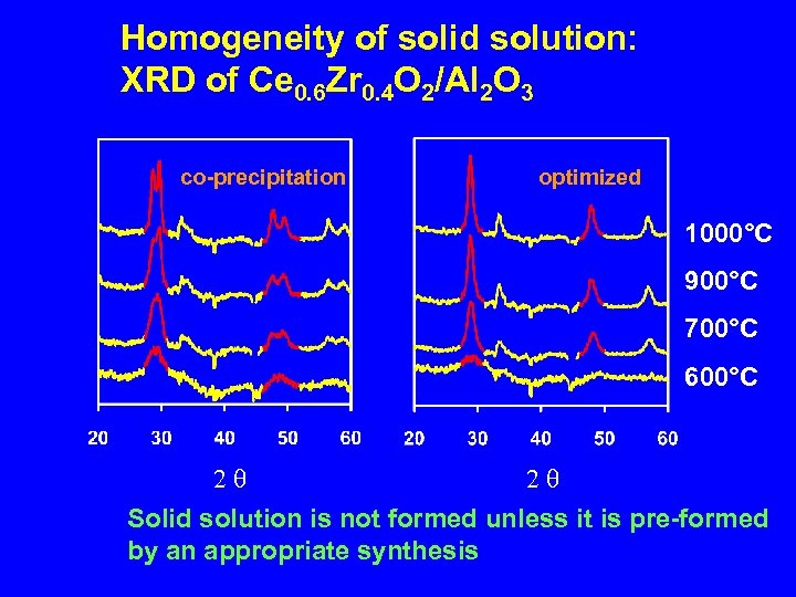 Homogeneity of solid solution: XRD of Ce 0. 6 Zr 0. 4 O 2/Al 2 O 3 co-precipitation optimized 1000°C 900°C 700°C 600°C 2 q 2 q Solid solution is not formed unless it is pre-formed by an appropriate synthesis