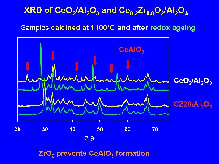 XRD of Ce. O 2/Al 2 O 3 and Ce 0. 2 Zr 0. 8 O 2/Al 2 O 3 Samples calcined at 1100°C and after redox ageing Ce. Al. O 3 Ce. O 2/Al 2 O 3 CZ 20/Al 2 O 3 2 q Zr. O 2 prevents Ce. Al. O 3 formation