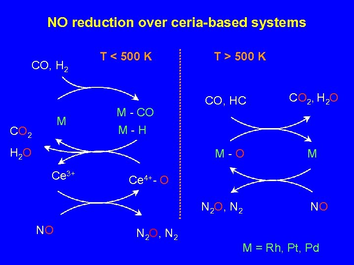NO reduction over ceria-based systems CO, H 2 M CO 2 T < 500 K M - CO M-H H 2 O T > 500 K CO, HC M-O Ce 3+ M Ce 4+- O N 2 O, N 2 NO CO 2, H 2 O N 2 O, N 2 NO M = Rh, Pt, Pd