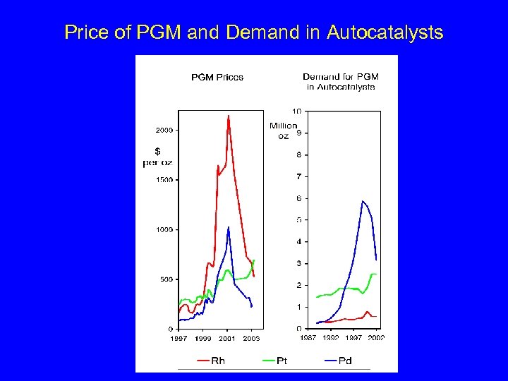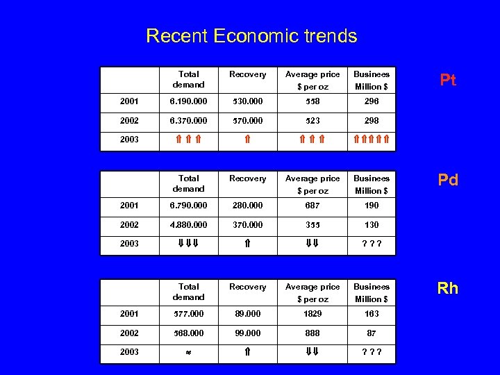 Recent Economic trends Total demand Recovery Average price $ per oz Businees Million $ 2001 6. 190. 000 530. 000 558 296 2002 6. 370. 000 523 298 2003 Total demand Recovery Average price $ per oz Businees Million $ 2001 6. 790. 000 280. 000 687 190 2002 4. 880. 000 370. 000 355 130 2003 ? ? ? Total demand Recovery Average price $ per oz Businees Million $ 2001 577. 000 89. 000 1829 163 2002 568. 000 99. 000 888 87 2003 ? ? ? Pt Pd Rh