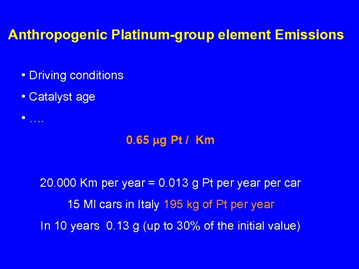 Anthropogenic Platinum-group element Emissions • Driving conditions • Catalyst age • …. 0. 65 mg Pt / Km 20. 000 Km per year = 0. 013 g Pt per year per car 15 Ml cars in Italy 195 kg of Pt per year In 10 years 0. 13 g (up to 30% of the initial value)
