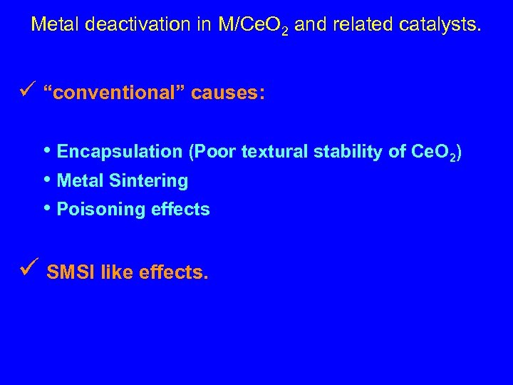 Metal deactivation in M/Ce. O 2 and related catalysts. ü “conventional” causes: • Encapsulation (Poor textural stability of Ce. O 2) • Metal Sintering • Poisoning effects ü SMSI like effects.