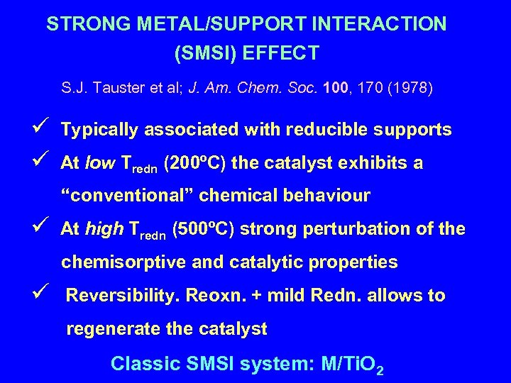 STRONG METAL/SUPPORT INTERACTION (SMSI) EFFECT S. J. Tauster et al; J. Am. Chem. Soc. 100, 170 (1978) ü ü Typically associated with reducible supports At low Tredn (200ºC) the catalyst exhibits a “conventional” chemical behaviour ü At high Tredn (500ºC) strong perturbation of the chemisorptive and catalytic properties ü Reversibility. Reoxn. + mild Redn. allows to regenerate the catalyst Classic SMSI system: M/Ti. O 2
