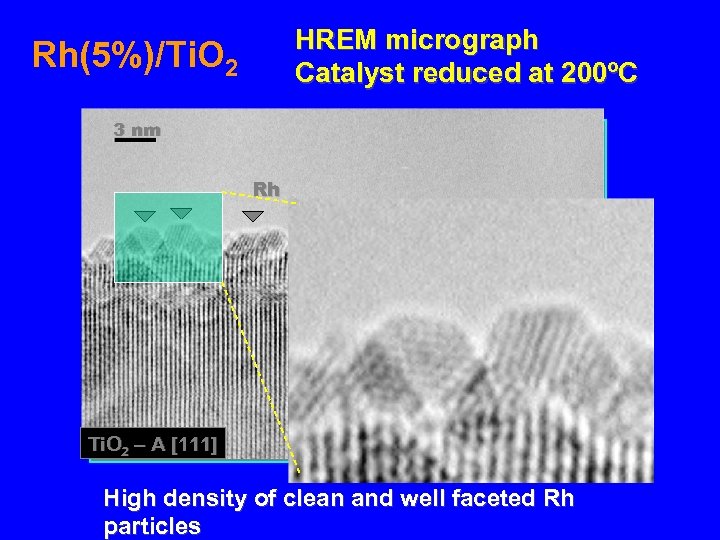HREM micrograph Catalyst reduced at 200ºC Rh(5%)/Ti. O 2 3 nm Rh Ti. O 2 – A [111] High density of clean and well faceted Rh particles