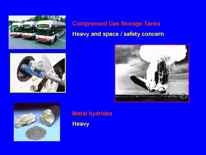 Hydrogen storage on - board Compressed Gas Storage Tanks Heavy and space / safety concern Metal hydrides Heavy