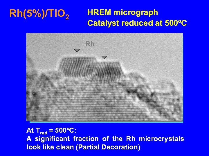 Rh(5%)/Ti. O 2 HREM micrograph Catalyst reduced at 500ºC Rh At Tred = 500ºC: A significant fraction of the Rh microcrystals look like clean (Partial Decoration)