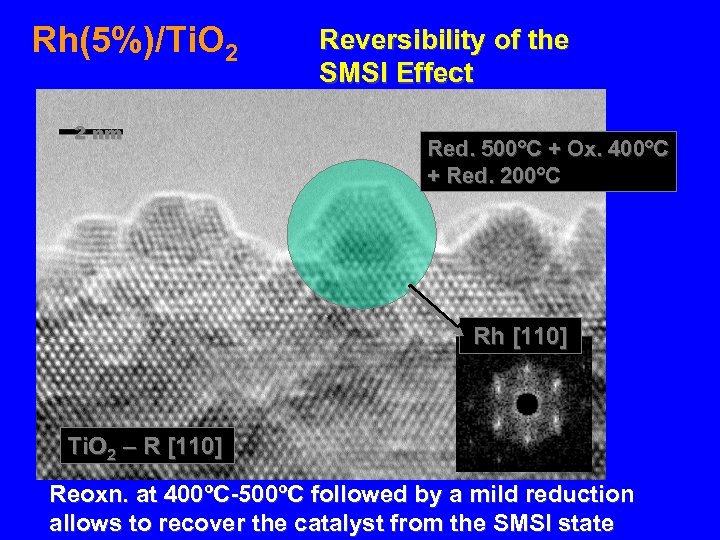 Rh(5%)/Ti. O 2 2 nm Reversibility of the SMSI Effect Red. 500ºC + Ox. 400ºC + Red. 200ºC Rh [110] Ti. O 2 – R [110] Reoxn. at 400ºC-500ºC followed by a mild reduction allows to recover the catalyst from the SMSI state