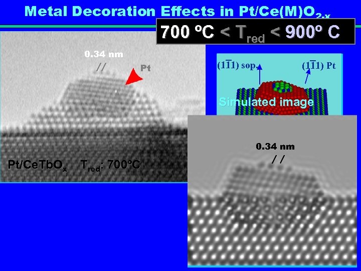 Metal Decoration Effects in Pt/Ce(M)O 2 -x 700 ºC < Tred < 900º C 0. 34 nm Pt (111) sop. (111) Pt Simulated image 0. 34 nm Pt/Ce. Tb. Ox Tred: 700ºC Monocapa de soporte 8° soporte[011] Pt [110]