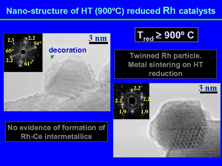 Nano-structure of HT (900ºC) reduced Rh catalysts 2. 3 2. 2 54° 65° 2. 2 Tred 900º C 3 nm decoración decoration Twinned Rh particle. Metal sintering on HT reduction 61° 3 nm 2. 2 1. 9 No evidence of formation of Rh-Ce intermetallics 2. 2 1. 9