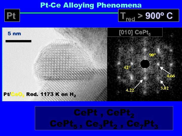 Pt-Ce Alloying Phenomena Pt Tred > 900º C 5 nm [010] Ce. Pt 5 90° 42° 4. 66 Pt/Ce. O 2 Red. 1173 K en H 2 4. 22 Ce. Pt , Ce. Pt 2 Ce. Pt 5 , Ce 3 Pt 2 , Ce 7 Pt 3 3. 02