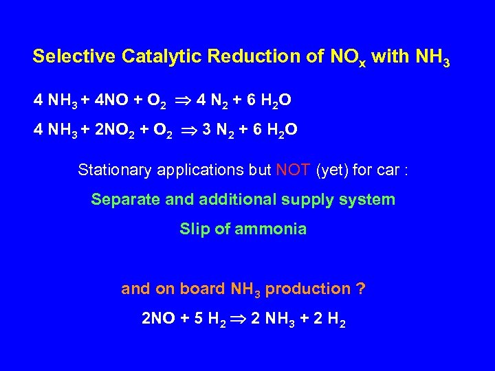 Selective Catalytic Reduction of NOx with NH 3 4 NH 3 + 4 NO + O 2 4 N 2 + 6 H 2 O 4 NH 3 + 2 NO 2 + O 2 3 N 2 + 6 H 2 O Stationary applications but NOT (yet) for car : Separate and additional supply system Slip of ammonia and on board NH 3 production ? 2 NO + 5 H 2 2 NH 3 + 2 H 2