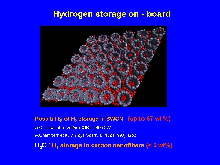 Hydrogen storage on - board Possibility of H 2 storage in SWCN (up to 67 wt %) A. C. Dillon et al. Nature 386 (1997) 377. A. Chambers et al. J. Phys. Chem. B 102 (1998) 4253. H 2 O / H 2 storage in carbon nanofibers (< 2 wt%) R. T Yang et al. Carbon 38 (2000) 623.