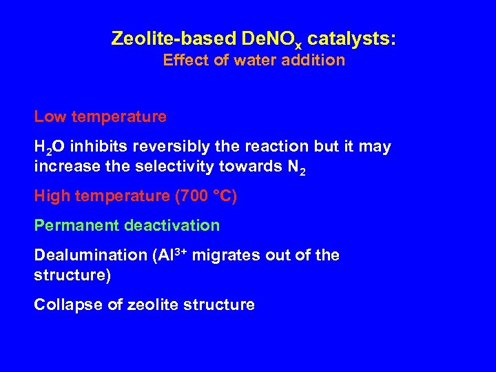 Zeolite-based De. NOx catalysts: Effect of water addition Low temperature H 2 O inhibits reversibly the reaction but it may increase the selectivity towards N 2 High temperature (700 °C) Permanent deactivation Dealumination (Al 3+ migrates out of the structure) Collapse of zeolite structure