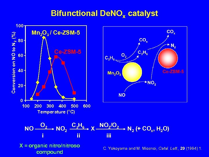 Bifunctional De. NOx catalyst Conversion on NO to N 2 (%) 100 Mn 2 O 3 / Ce-ZSM-5 80 Ce-ZSM-5 60 40 20 0 100 200 300 400 500 600 Temperature (°C) NO O 2 i NO 2 C 3 H 6 ii X = organic nitro/nitroso compound X NO 2/O 2 iii N 2 (+ COx, H 2 O) C. Yokoyama and M. Miosnoi, Catal. Lett. , 29 (1994) 1.
