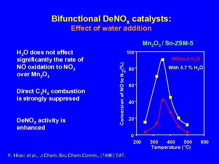 Bifunctional De. NOx catalysts: Effect of water addition Mn 2 O 3 / Sn-ZSM-5 Direct C 3 H 6 combustion is strongly suppresed De. NOX activity is enhanced 100 Conversion of NO to N 2 (%) H 2 O does not effect significantly the rate of NO oxidation to NO 2 over Mn 2 O 3 Without H 2 O 80 60 40 200 Y. Hirao et al. , J. Chem. Soc. Chem. Comm. , (1996) 597. With 5. 7 % H 2 O 300 400 500 Temperature (°C) 600