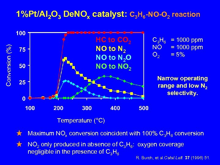 Conversion (%) 1%Pt/Al 2 O 3 De. NOx catalyst: C 3 H 6 -NO-O 2 reaction HC to CO 2 NO to N 2 O NO to NO 2 C 3 H 6 = 1000 ppm NO = 1000 ppm O 2 = 5% Narrow operating range and low N 2 selectivity. Temperature (°C) Maximum NOx conversion coincident with 100% C 3 H 6 conversion NO 2 only produced in absence of C 3 H 6: oxygen coverage negligible in the presence of C 3 H 6 R. Burch, et al. Catal. Lett. 37 (1996) 51.