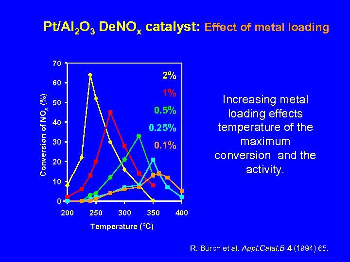 Pt/Al 2 O 3 De. NOx catalyst: Effect of metal loading 70 2% Conversion of NOx (%) 60 1% 50 0. 5% 40 0. 25% 30 0. 1% 20 Increasing metal loading effects temperature of the maximum conversion and the activity. 10 0 200 250 300 350 400 Temperature (°C) R. Burch et al. Appl. Catal. B 4 (1994) 65.