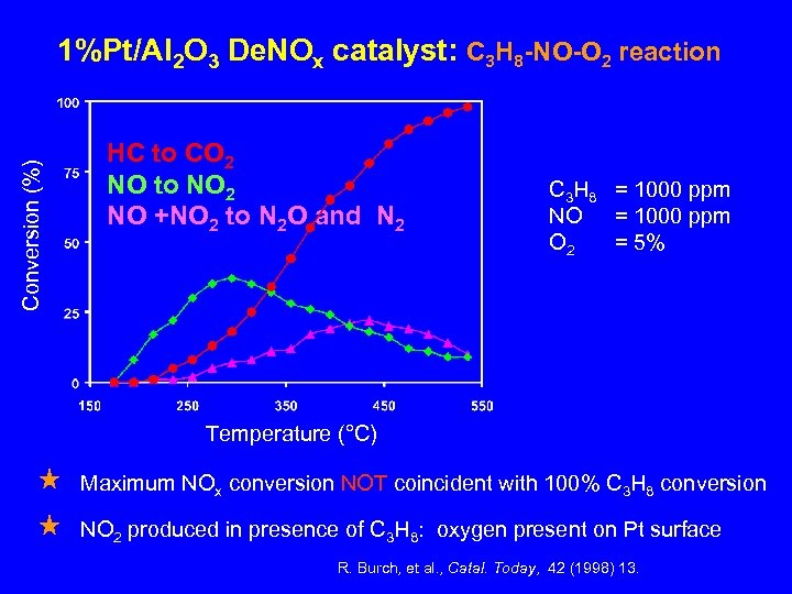 Conversion (%) 1%Pt/Al 2 O 3 De. NOx catalyst: C 3 H 8 -NO-O 2 reaction HC to CO 2 NO to NO 2 NO +NO 2 to N 2 O and N 2 C 3 H 8 = 1000 ppm NO = 1000 ppm O 2 = 5% Temperature (°C) Maximum NOx conversion NOT coincident with 100% C 3 H 8 conversion NO 2 produced in presence of C 3 H 8: oxygen present on Pt surface R. Burch, et al. , Catal. Today, 42 (1998) 13.