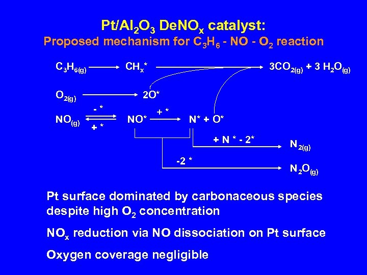 Pt/Al 2 O 3 De. NOx catalyst: Proposed mechanism for C 3 H 6 - NO - O 2 reaction C 3 H 6(g) CHx* O 2(g) NO(g) 3 CO 2(g) + 3 H 2 O(g) 2 O* -* +* NO* +* N* + O* + N * - 2* -2 * N 2(g) N 2 O(g) Pt surface dominated by carbonaceous species despite high O 2 concentration NOx reduction via NO dissociation on Pt surface Oxygen coverage negligible